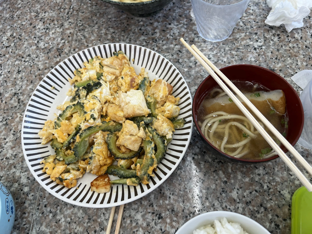 沖縄そばは体感1.5倍くらいのボリュームで、ゴーヤチャンプルーもたっぷり。