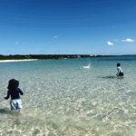 2歳半の次女は、以前オーストラリアの海で波と砂を怖がって泣いてばかりいたのですが、ここでは少しずつ水に慣れ、自分から歩いて入ろうとする姿も。