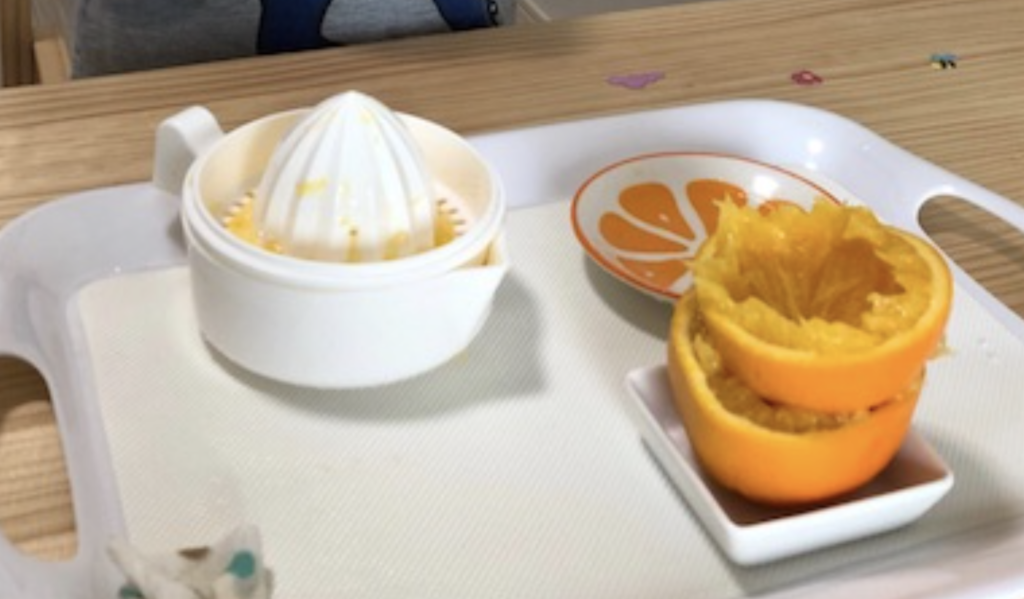 オレンジ🍊ジュースはまだあまり握力が強くないため一人で最後まで絞るのはさすがに難しいですが、最初にジュースが出てくるのを見るだけでも大喜びです。